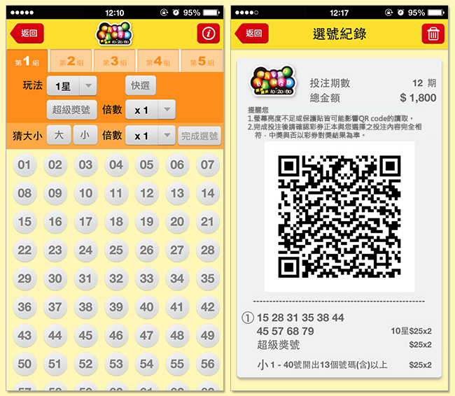 如果您的智慧型手機為iOSAndroid之作業系統,您可先下載「台彩行動選號」APP,並利用 APP中的「我要選號」功能,填寫投注內容。每張電子選號單皆將產生一個QR code,至投注站掃描該QR Code,即可自動印出彩券,付費後即完成交易。